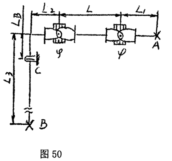 c.在较短的管段上安装两个单式铰链膨胀节的情况如图50所示。
